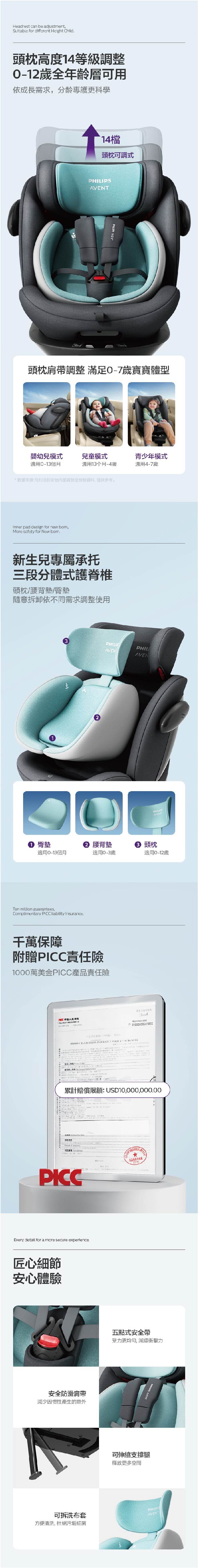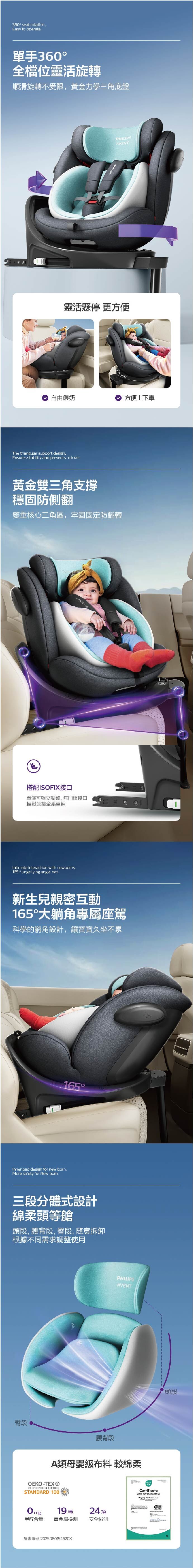 • 適用身高40-150cm,最大承重36kg,支援雙向安裝與雙向旋轉,方便隨需切換,並具14段頭枕調節和多重貼心設計