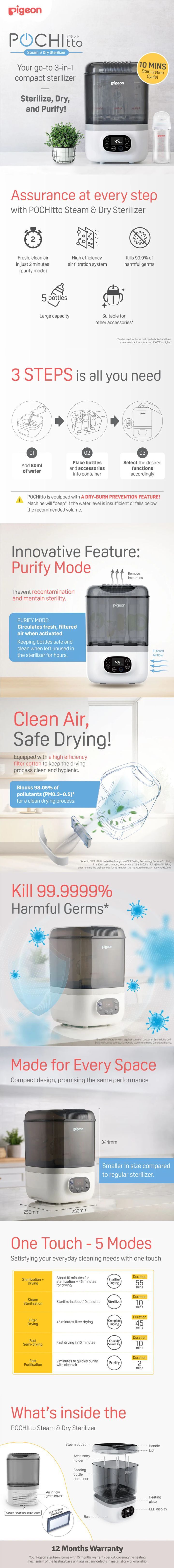 Pigeon的全新POCHItto 3合1電子蒸氣消毒烘乾機,一鍵便能自動消毒乾燥,同時儲存日常嬰兒用品,只需加水即可使用,無須加入消毒液,最多可同時放入5個母乳實感奶瓶。