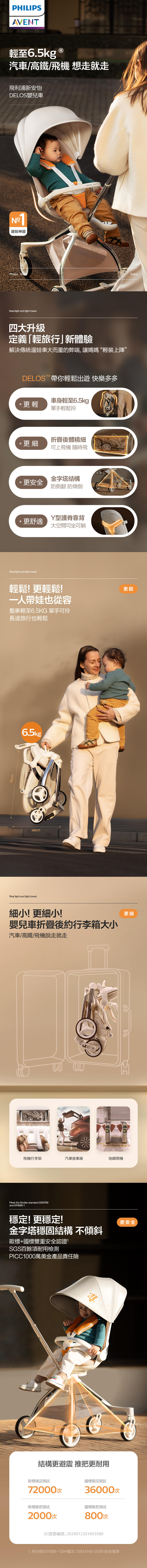 - Philips Avent 嬰兒推車 DELOS DELOS 多樂推車重量僅6kg,輕巧便攜,滿足歐盟及中國3C安全標準,帶來更安心的外出體驗。