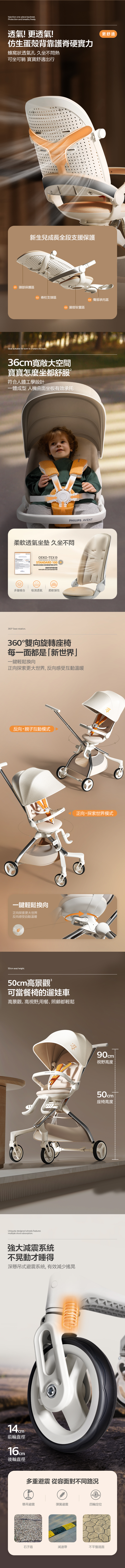 - 獨特360°雙向旋轉座椅、95-175度三檔躺平設計與4段調節拉柄,隨心切換,陪伴寶寶不同成長階段與出行場景(城市、社區、公園、短途旅行等)。